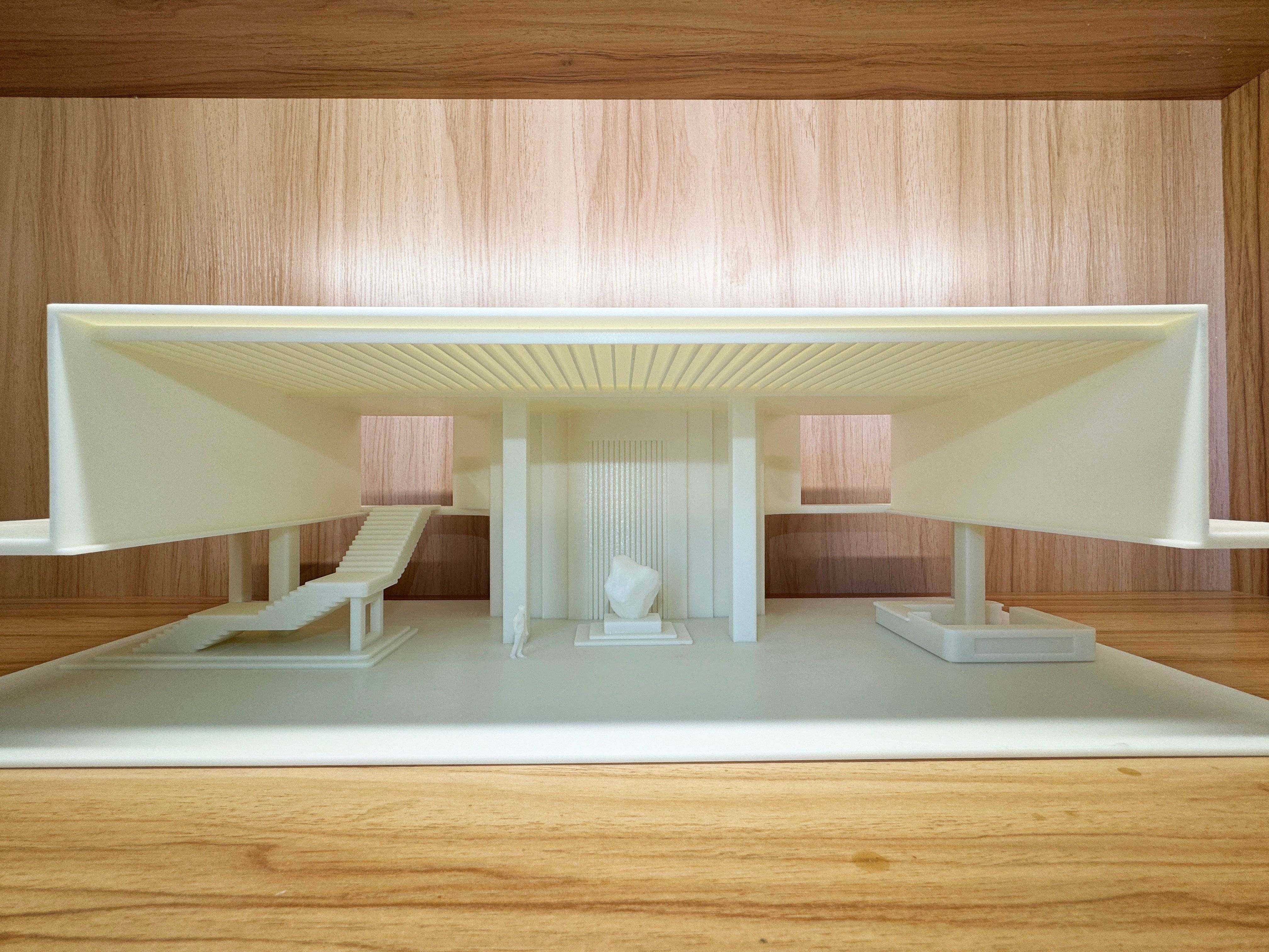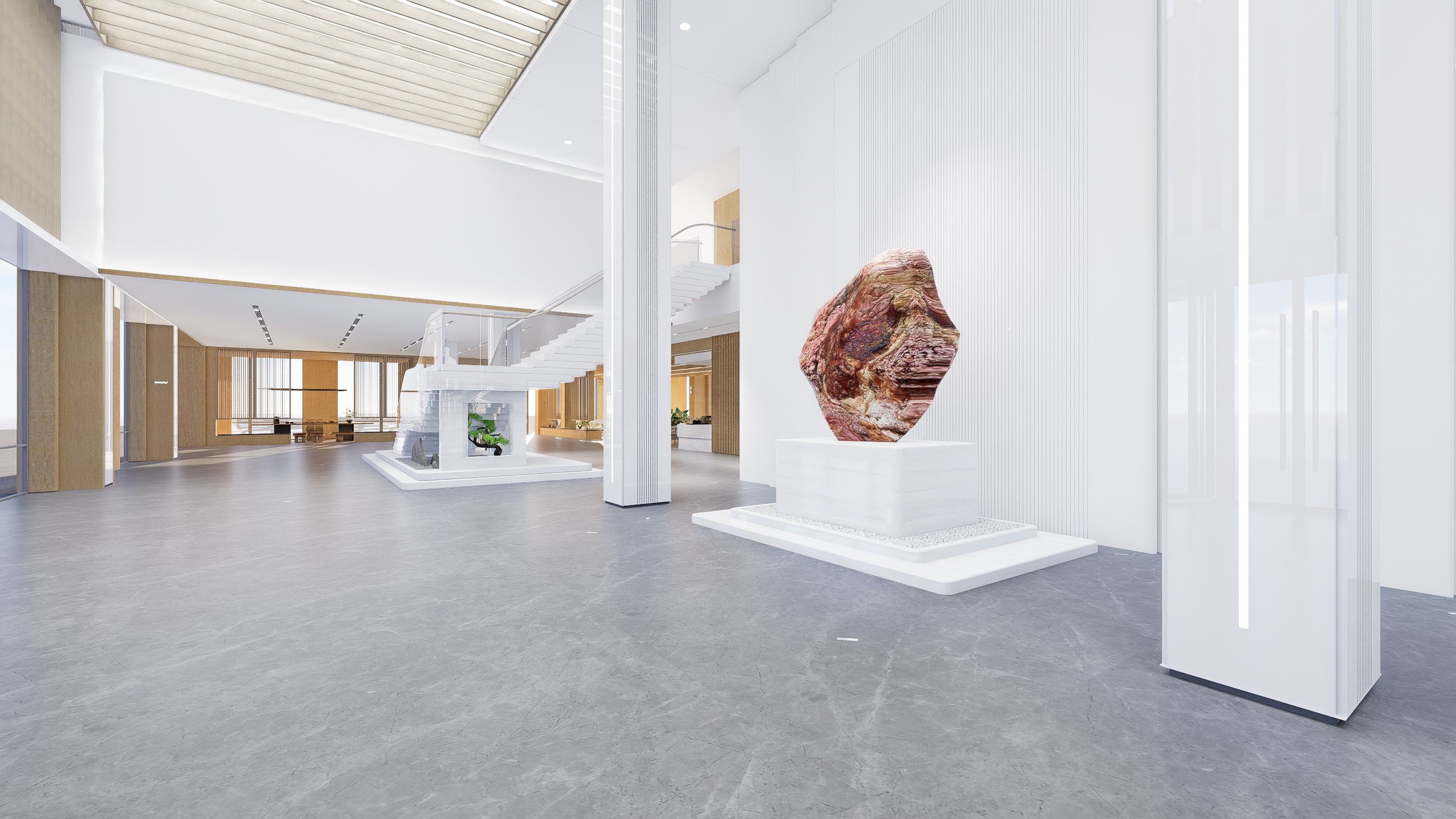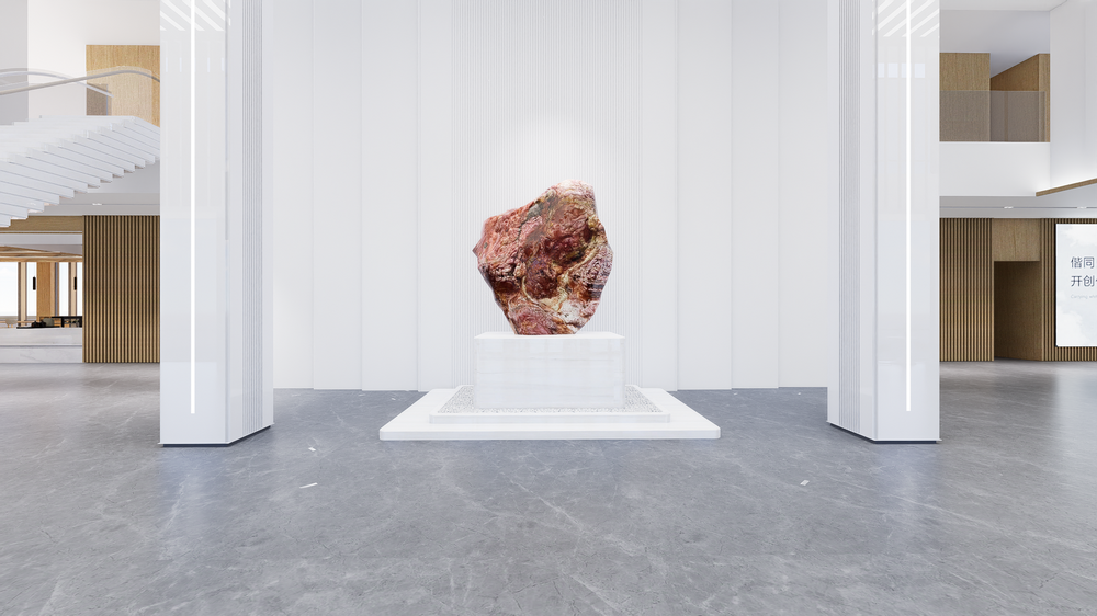 底座采用多层递进的台阶式结构,在比例上与雕塑体量形成1:√2 的中式最佳比例,既强化了作品的仪式感,又在视觉上延展了空间的纵深感。